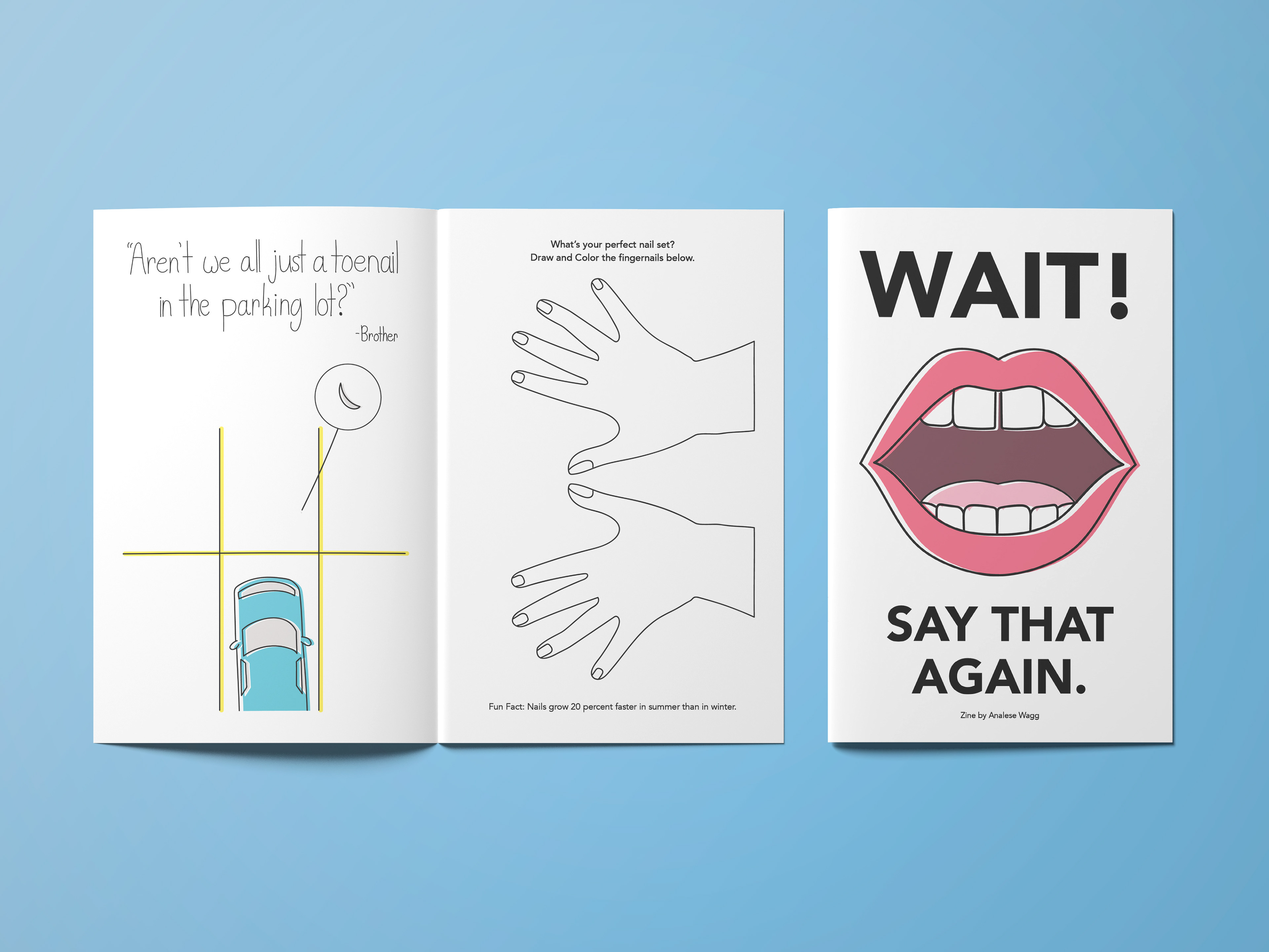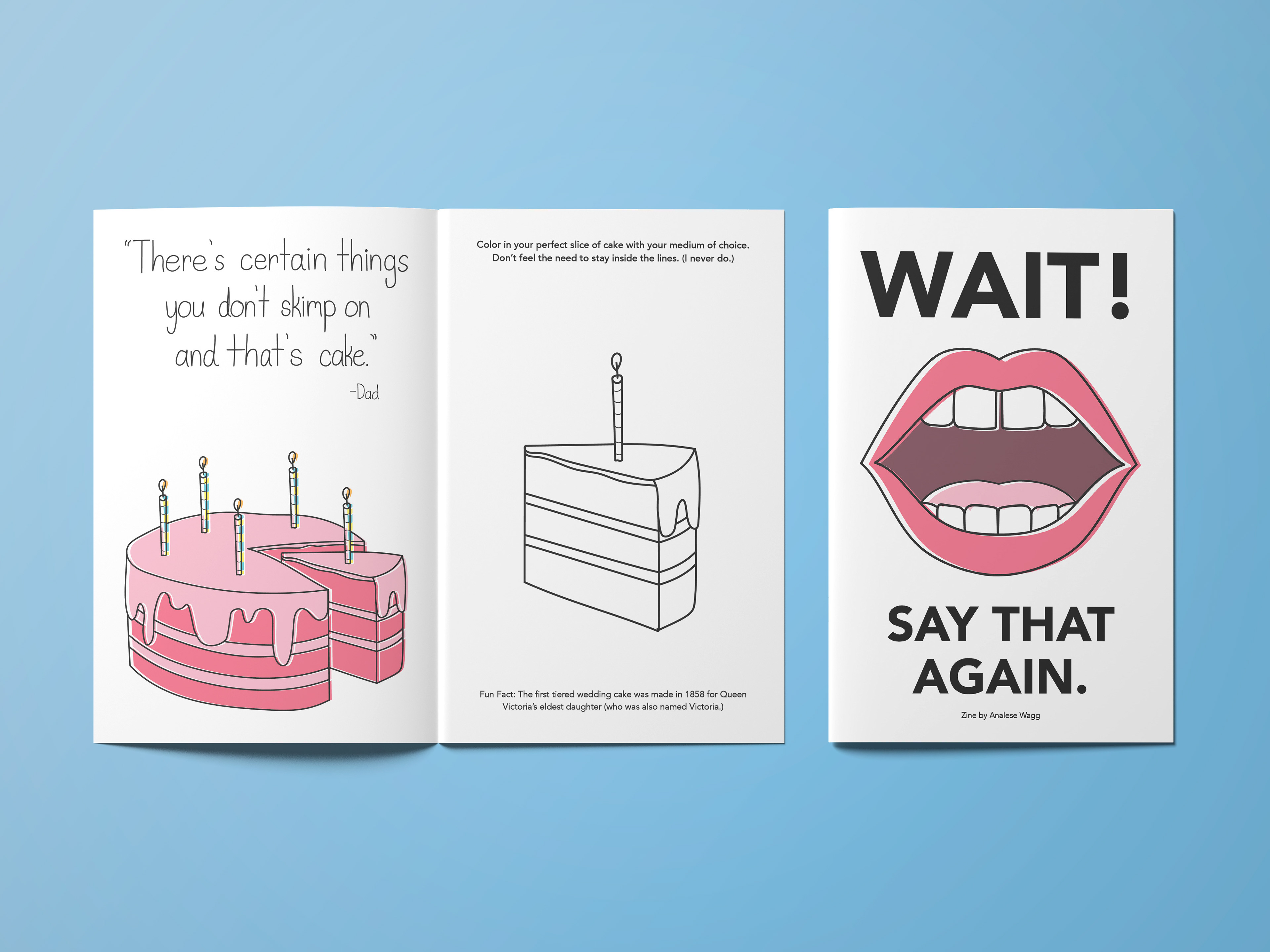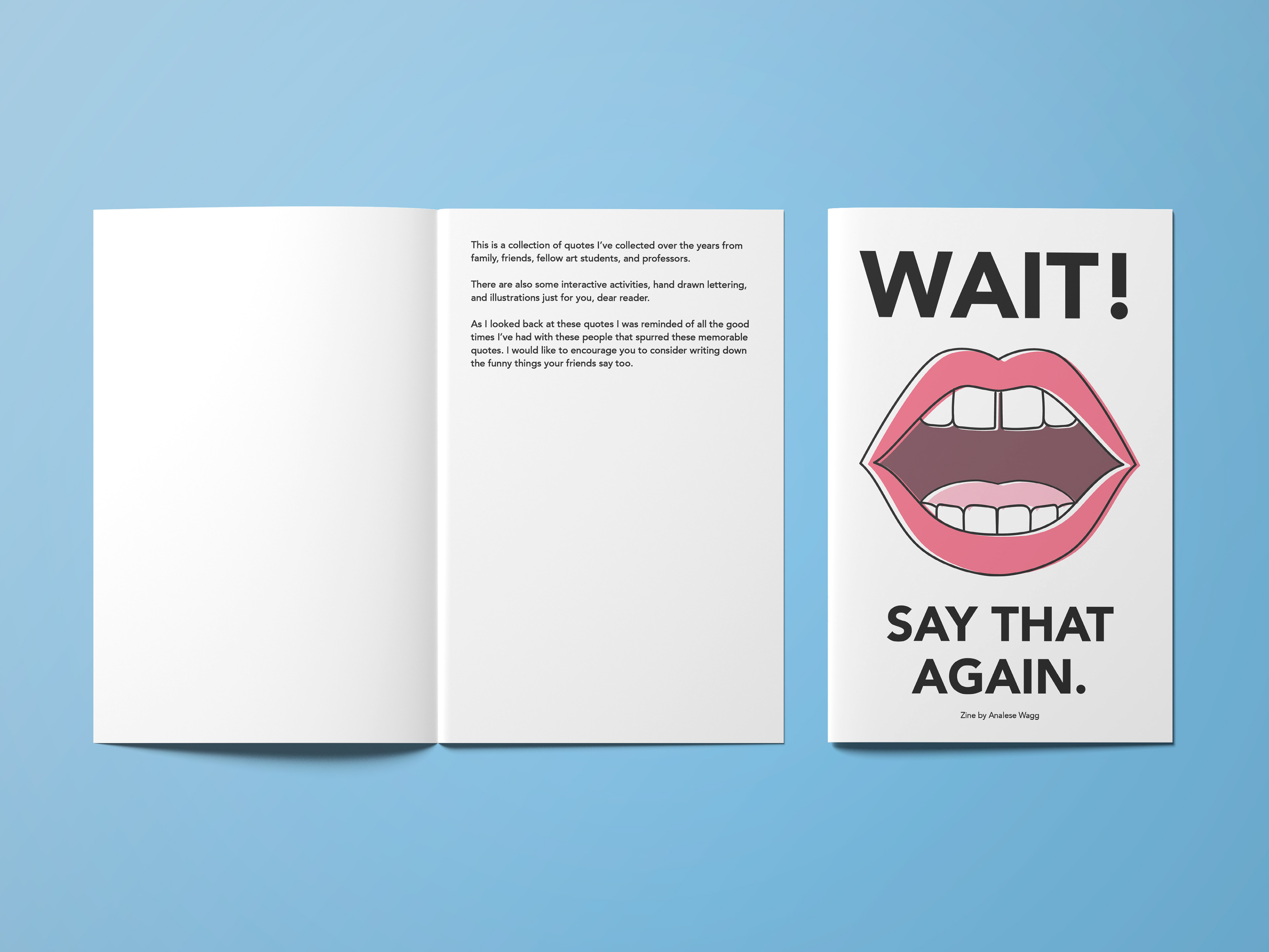 This is a zine containing real quotes collected from friends and family over the years as well as illustrations and activities for the reader! I wanted this zine to feel almost like an adult coloring book while playing off the idea of nostalgia and appreciation for the simple things in life.