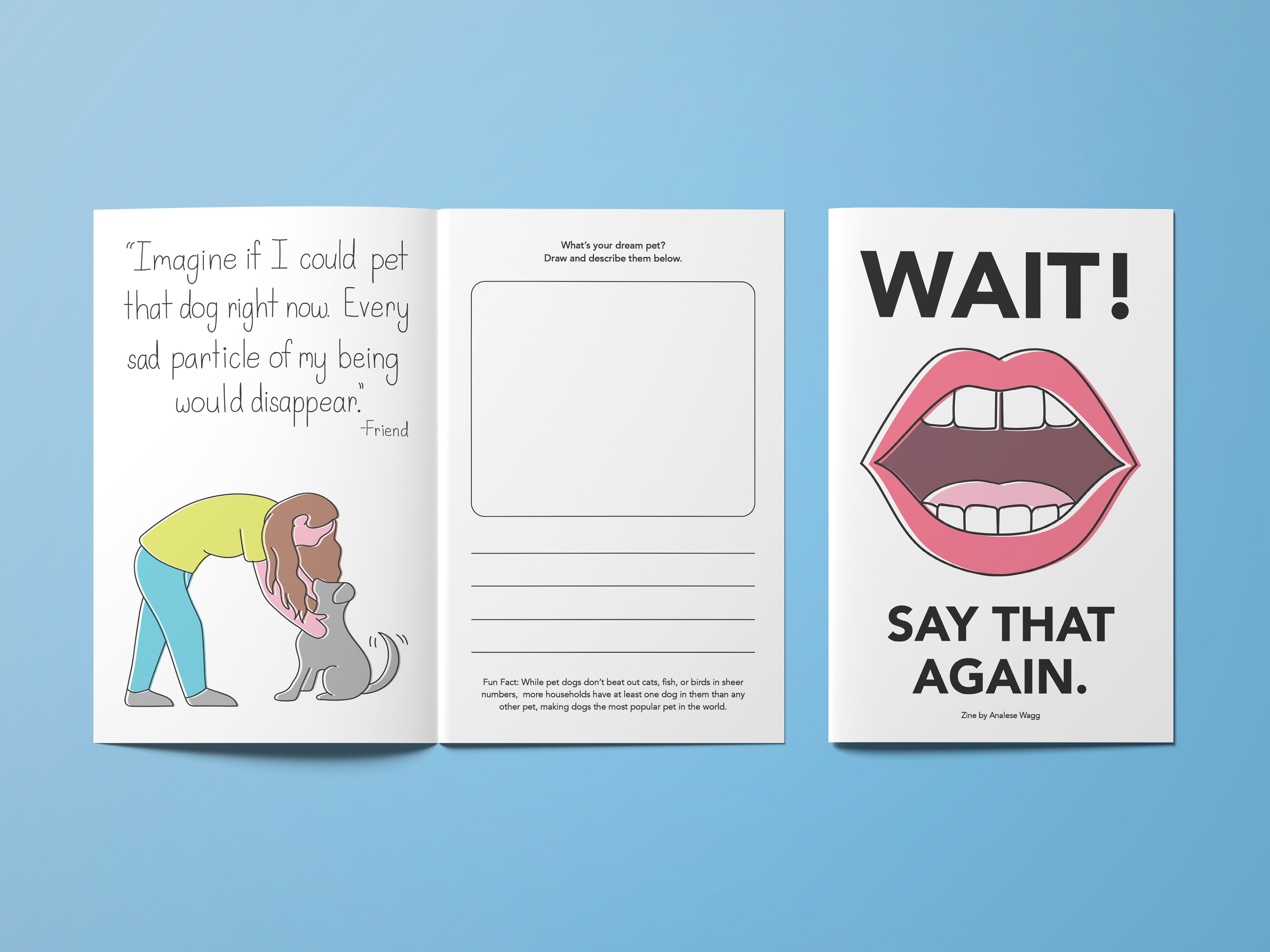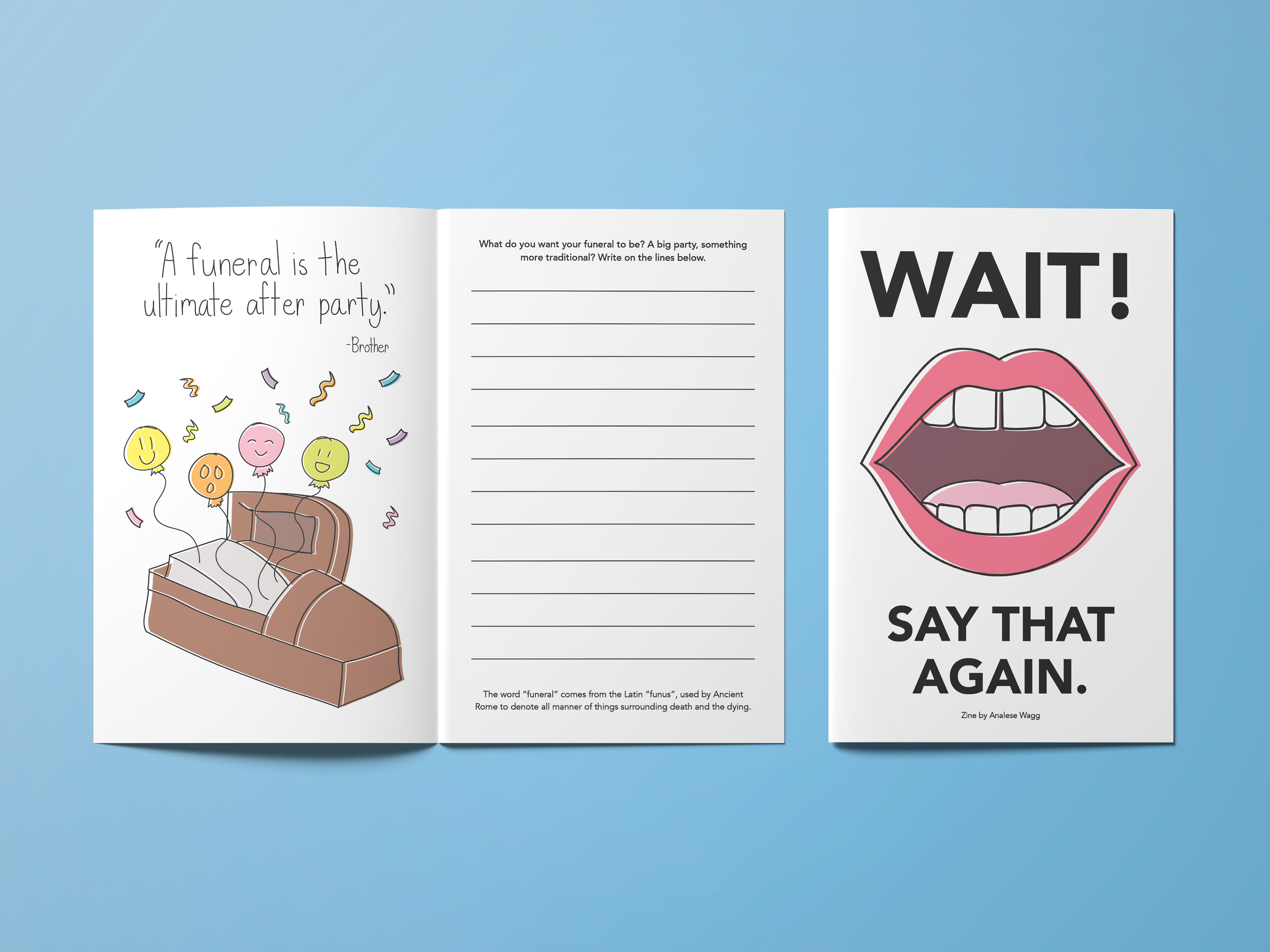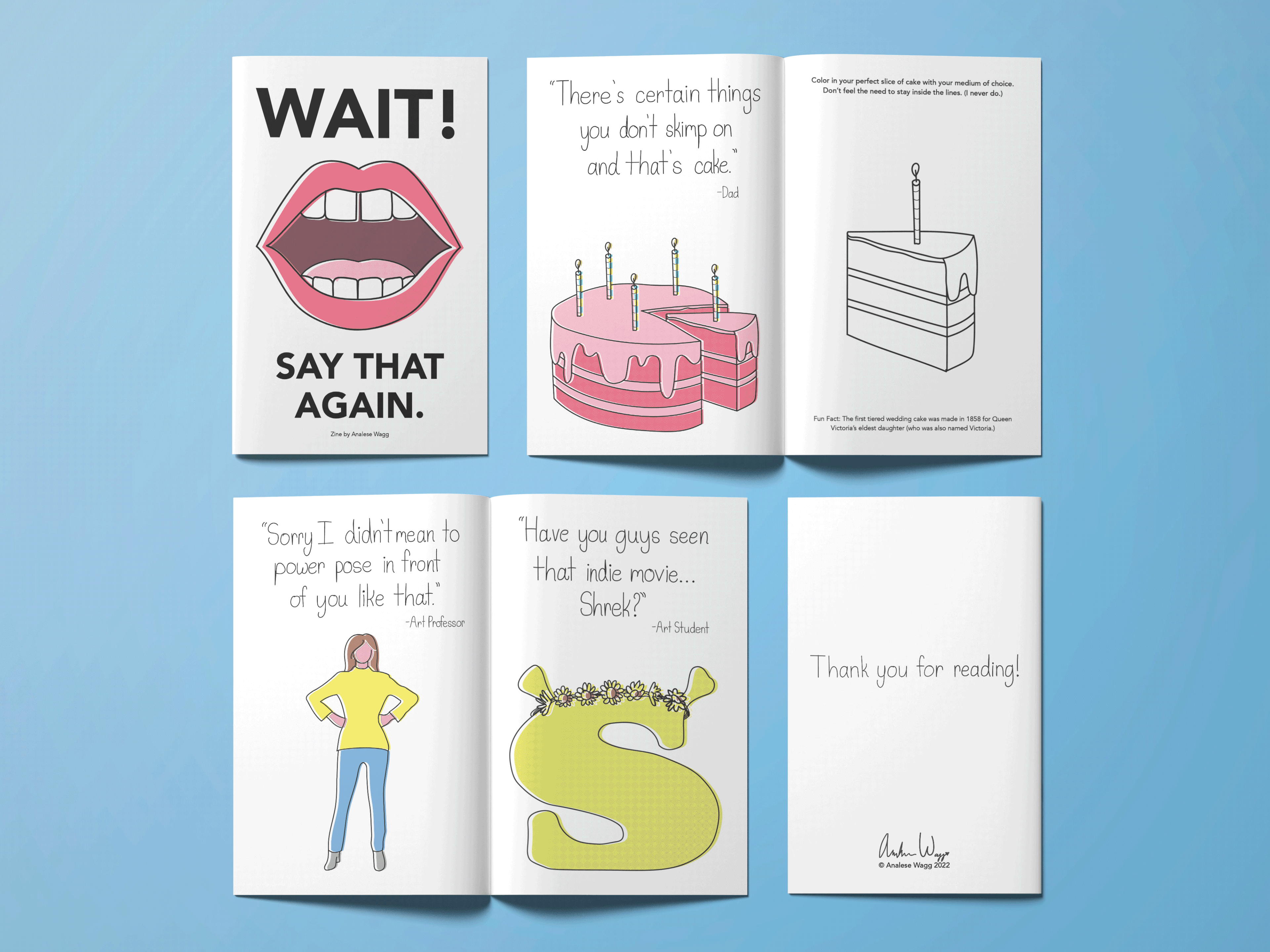 This is a zine containing real quotes collected from friends and family over the years as well as illustrations and activities for the reader! I wanted this zine to feel almost like an adult coloring book while playing off the idea of nostalgia and appreciation for the simple things in life.